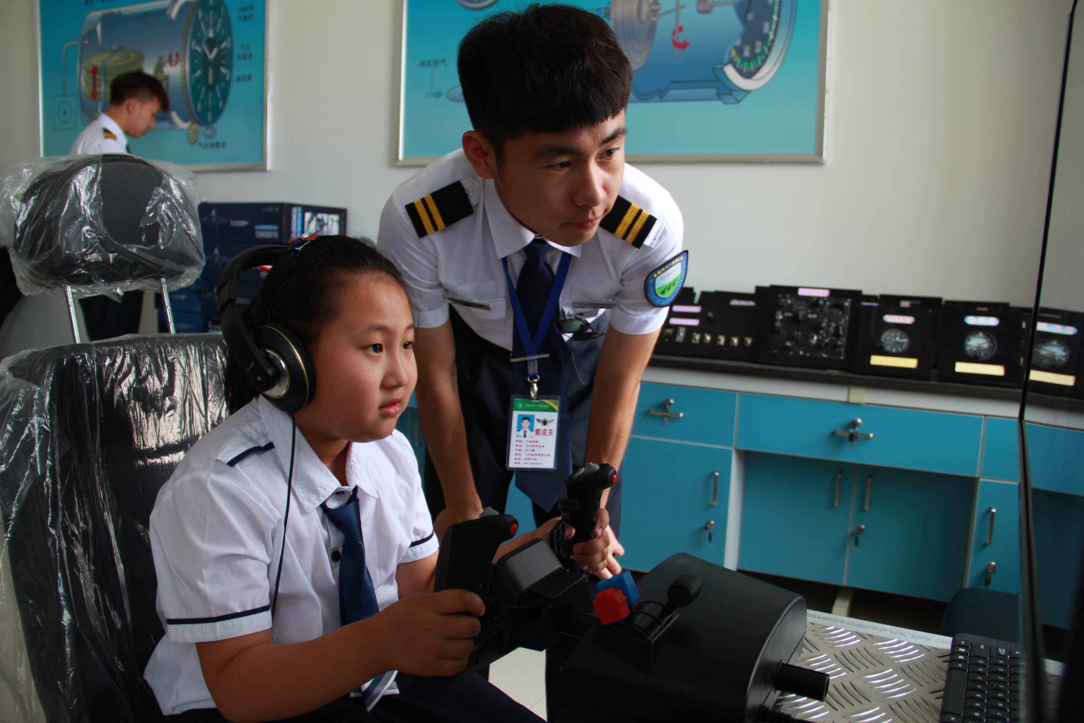 在活动中,小员工实地参观了退役的Y-11飞机,参观了飞行技术专业的飞行模拟实验室和飞行仪器仪表实验室,了解飞机的基本飞行原理和飞机仪表的基本工作状态,在飞机技术专业2017级飞行学员的协助下,二年三班的小员工在塞斯纳172R全状态飞行模拟训练器体验了一次完整的起落航线飞行过程。活动中,小员工们踊跃提问,飞行学员志愿者也耐心的详细解答、亲身示范。参观过程中,飞行技术专业专业教师借着普及飞行知识的同时,向小员工介绍了我国国产C919大飞机的部分知识,同学们了解到,C919国产大飞机试飞成功,代表了我们国家的制造业,我们国家的飞行行业走在了世界的前列,孩子们高兴地喊,“我们国家真厉害,我为我们国家骄傲”!许多员工现场许下心愿,今后一定保护好视力,更加努力学习,长大之后要成为一名飞行员,为国家奉献自己的力量。