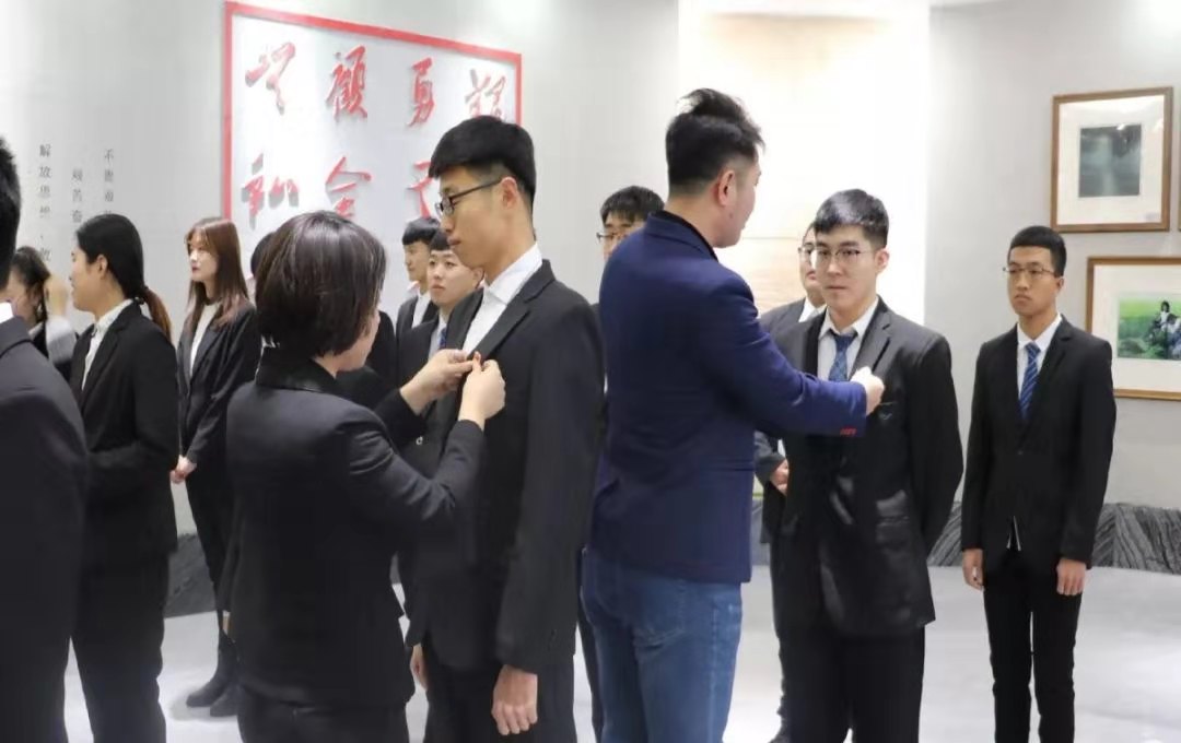 宣誓前,三位党支部书记为预备党员们佩戴了党徽,小小的党徽在每一名预备党员胸前闪耀。