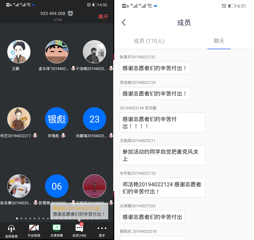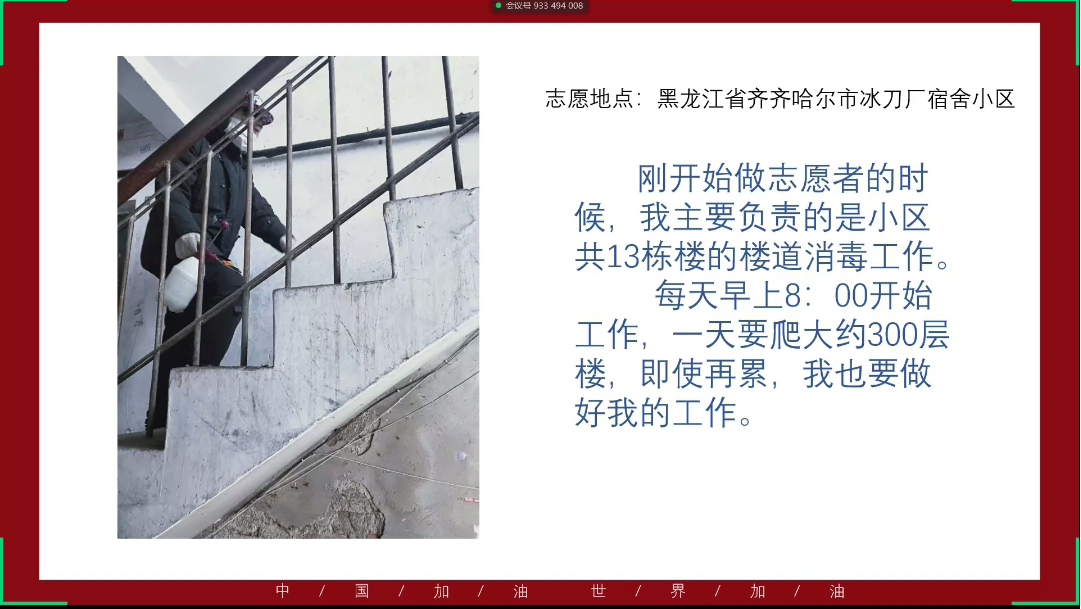 此次活动由四名优秀志愿者进行分享,18级志愿者张弛同学、19级的志愿者徐佳琦同学、张煊同学以及于浩楠同学分别发表线上演讲,对自己的志愿工作做出总结与分享,讲述了自己是如何坚持站好自己的岗,贡献着自己的温暖,通过社区内的不断帮助,共同发放消毒用品、检查通行证、测量体温,用自己的努力防卫着热爱的家园,用自己的行动为这场“战役”贡献着自己的力量。