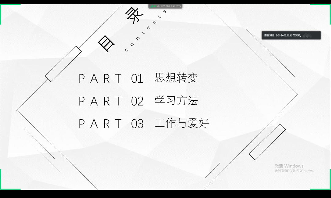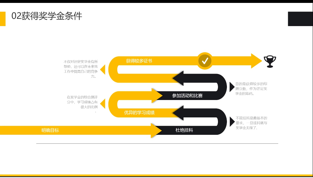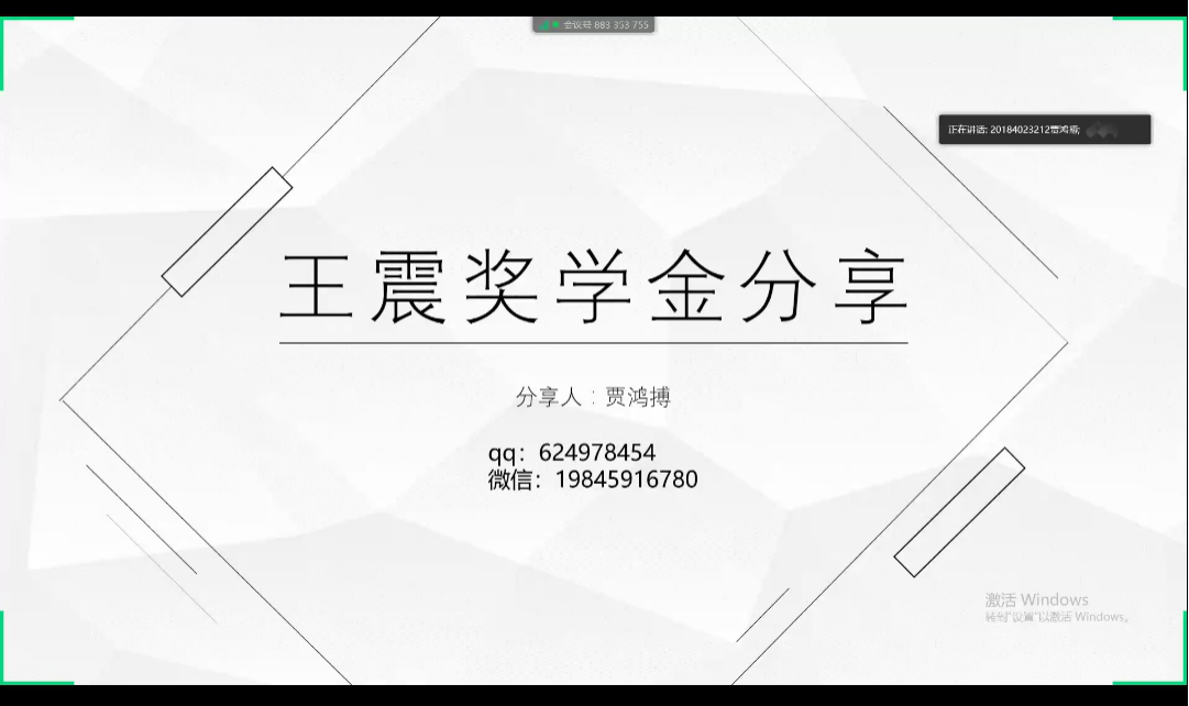在会议过程中贾鸿博同学将分享内容分为了思想转变,学习方法,工作与爱好三个部分,而且上课时坐第一排会充分提高学习效率,考试之前要有适合的资料增加复习效率;郝宇凡同学告诉同学们上大学要脚踏实地,不能满足于及格,要有积极的态度,饱满的热情才能向自己的目标迅速前进;吴立东同学提醒同学们要提高自己的品行,不能把获得奖学金而作为最终目的,作为高素质人才要摆正自己的位置。