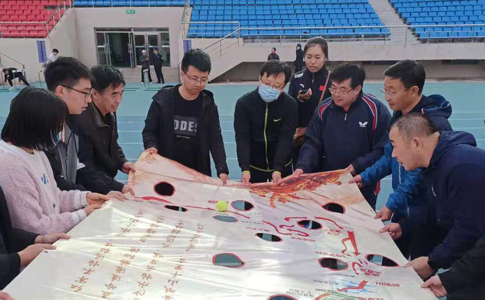 在“重走长征路”团建游戏中,学校、学院领导以及参赛教师共同通过众人手持长征地图倾斜角度,使小球沿长征路线滚动并抵达目的地。
