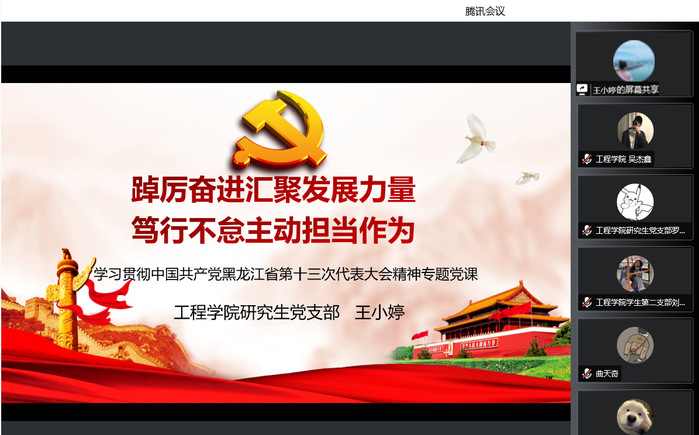 6月23日,研究生党支部召开学习黑龙江省第十三次党代会精神专题党课,党支部书记王小婷作题为“踔厉奋进汇聚发展力量 笃行不怠主动担当作为”的专题党课,党支部全体党员通过腾讯会议平台参加党课学习。