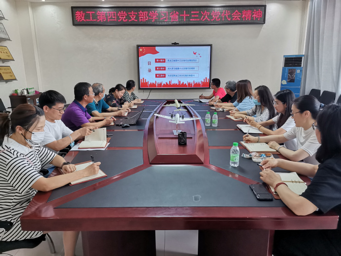 6月20日,教工第四党支部召开学习会议,传达学习贯彻省第十三次党代会精神,全体党员通过线下参加的方式参与学习,第四党支部书记刘天祥同志主讲。