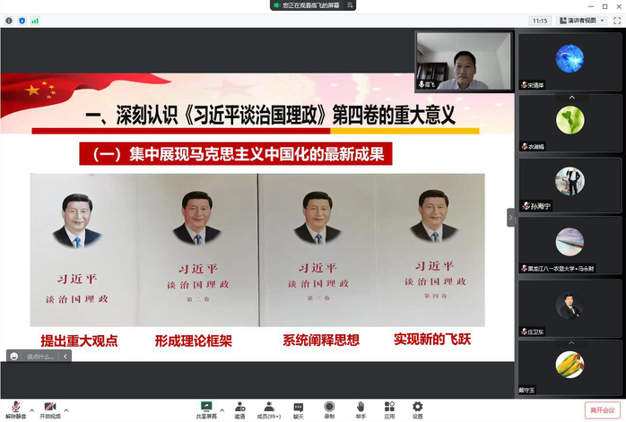 会议邀请马克思主义学院副教授高飞以《学深悟透〈习近平谈治国理政〉第四卷》为题,从深刻认识《习近平谈治国理政》第四卷的重大意义、准确把握《习近平谈治国理政》第四卷的主要内容与核心要义、全面贯彻《习近平谈治国理政》第四卷精神三个方面,结合《习近平谈治国理政》第一卷、第二卷、第三卷的相关内容,对《习近平谈治国理政》第四卷进行了梳理。整场讲座内容丰富、精彩生动、见解深刻,为下一步开展学习明晰了学习重点。