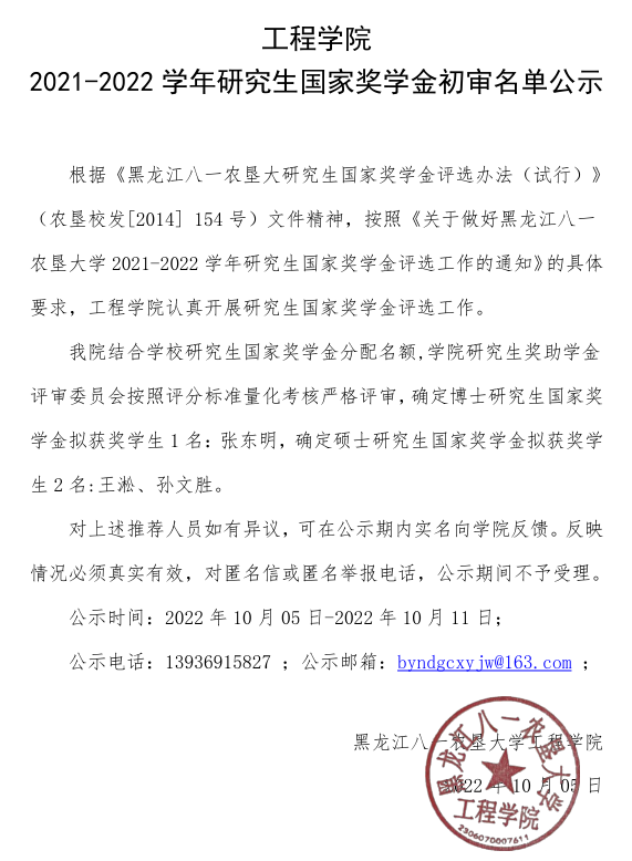 公司2021-2022 学年研究生国家奖学金初审名单公示