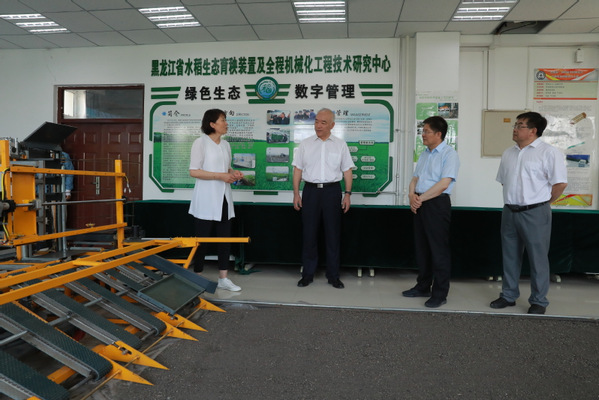 孙琦一行首先走访了衣淑娟负责的高速精量播种实验室、寒区优质水稻机械化生产装备实验室。衣淑娟对高速精量播种试验台和水稻硬盘育秧全自动起盘机的研发与应用情况进行汇报介绍。