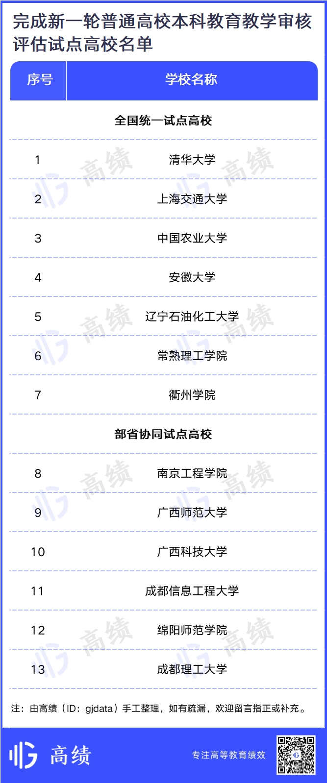 在这种背景下,大家就更为关注清华大学、上海交通大学、中国农业大学、安徽大学、辽宁石油化工大学、常熟理工学院和衢州学院7所全国统一试点高校的审核评估动向,以便推测出审核评估的全貌。