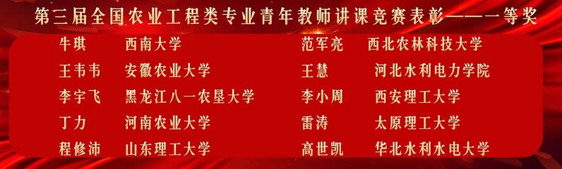 研讨会采取学术报告、专题研讨、青年教师教学竞赛相结合的形式进行。农业机械化及其自动化系青年教师李宇飞代表学校参加了第三届全国农业工程类专业青年教师讲课竞赛并获得一等奖。竞赛中,李宇飞依据《农业机械学》课程特点,通过融入课程思政、深化教学认知、转换教学范式、丰富教学内容、创新教学方法等方式,展示了独具特色的教学设计和教学风采。