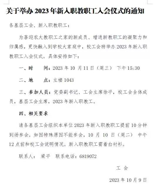 关于举办2023年新入职教职工入会仪式的通知
