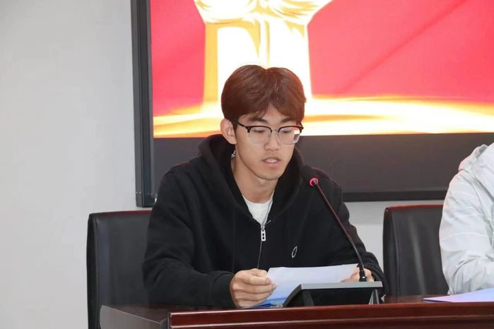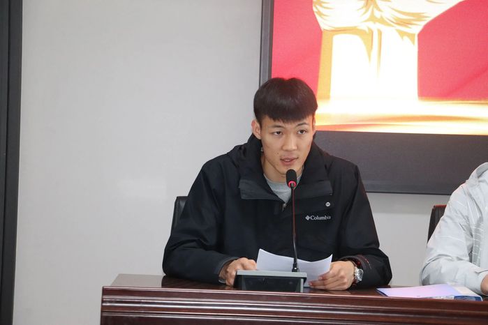 会议伊始,胡鹏飞同学作为队伍里面经验丰富的老队员进行发言,强调体育是生命之光、强国标志,更是个人全面发展的基石。随后,运动员代表黄奕豪同学也分享了田径训练的艰辛与成长的心路历程。