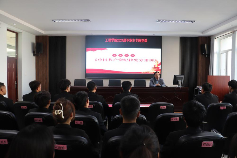 公司党委副书记孙海宁为全体毕业生党员上最后一堂专题党课,并对毕业生党员提出两点希望,一是要牢记党员身份,贯彻学习《中国共产党纪律处分条例》,知纪、明纪、守纪,坚定责任担当;二是要志存高远,脚踏实地,精益求精,增强党员意识、牢记党员身份,做就业创业、毕业教育的先锋,做文明交流互鉴的表率。