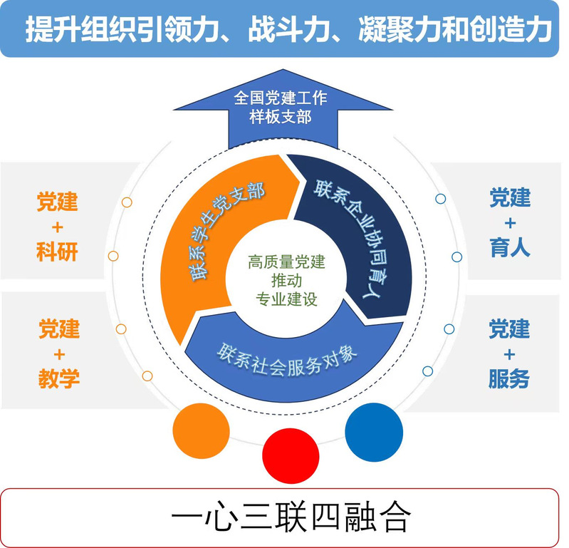 党支部围绕中心、服务大局,建立了“一心三联四融合”工作模式,将党建工作渗透人才培养、教学研究、社会服务工作的全过程,大力提升党支部的领导力、战斗力、凝聚力和创造力,保障党建工作和业务工作协调并进。