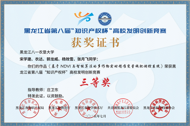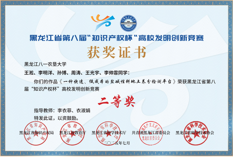 近日,黑龙江省第八届“知识产权杯”高校发明创新竞赛在哈尔滨工程大学圆满闭幕。公司由李衣菲老师、衣淑娟教授指导的作品《一种快速、低成本的盐碱性耕地土养分检测平台》荣获发明组二等奖、由庄卫东教授指导的作品《基于NDVI与智能算法的多作物实时精准变量施肥调控系统》荣获发明组三等奖。