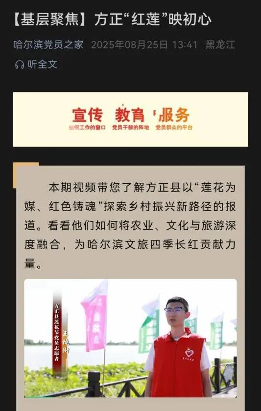 实习期间,王镜衔主动扛起志愿服务重任,成为方正县重大活动保障的“青春守护者”。在全民运动会中,他全程参与赛事引导、秩序维护与物资分发,从晨光初绽到夜色降临,始终坚守岗位、耐心细致;在方正莲花节期间,他全力做好游客接待工作,确保活动各环节顺畅推进,以热情服务赢得参与者好评。